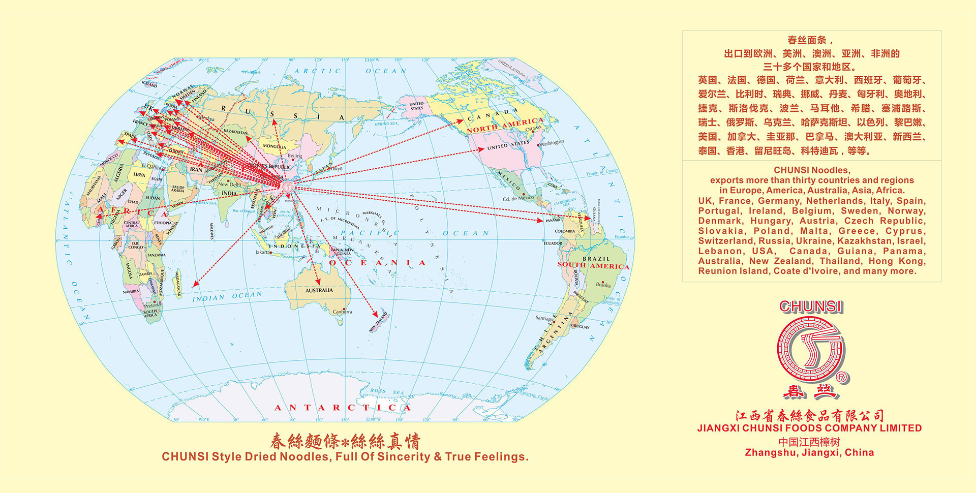 江西省春絲食品有限公司位于江西省樟樹市。 樟樹具有制作面條的悠久歷史傳統。古來即有民謠:“臨江府、清江縣(即樟樹),六歲伢仔會做面?!?今春絲公司是江西省內具有規模的面條、米粉加工企業,也是全國知名的面條生產企業。春絲公司現擁有“春絲”、“凌波仙子”、“絲絲福”、“春佳”四大品牌,一百多個品種。所有面條、米粉產品均選用合格原料,符合國家質量和衛生標準。產品具有安全健康、面體勁道、柔韌爽滑、易熟、久煮不糊、不渾湯等特色,深受廣大消費者歡迎。春絲產品已全面進入沃爾瑪、家樂福、樂購、歐尚、好又多、易初蓮花等大型超市,并遠銷美國、日本、英國、德國、法國、西班牙、意大利、葡萄牙、香港等二十多個國家和地區。